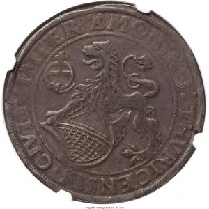 This specimen was lot 34297 in Heritage sale 3049 (Long Beach, September 2016), where it sold for $376. The catalog description[1] noted, "Zurich. City Taler 1559 AU53 NGC, Zürich mint, Hans Gutenson as mintmaster. A deeply toned and wholly original example, well-struck for the type on an above-average planchet. From the Redwood Collection, Part II." Davenport lists this type with numerous varieties for 1558-61.