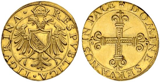 "SWITZERLAND | Zurich | Stadt und Kanton. Goldkrone o. J. Zürich. Doppeladler mit kleinem Schild. RESPVBLICA ° TIGVRINA °. Rv. Lilienkreuz. DOMINE SERVA NOS IN PACE. Äusserst selten. Fast FDC. Kleiner Kratzer, sonst prachtvolle Erhaltung. (city and canton of Zurich, undated gold crown, Zürich mint. Obverse: double headed eagle with small shield; reverse: floriate cross. Extremely rare, About uncirculated, Minor scratch, magnificent condition.)"
