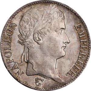 This specimen was lot 34119 in Stack's Bowers NYINC sale (New York, January 2025), where it sold for $14,400. The catalog description[1] noted, "FRANCE. Empire. 5 Francs, 1813-R. Rome Mint. Napoleon I. PCGS MS-61. A VERY RARE offering, this Rome-produced crown stands as the finest representative of the date and mint in PCGS census, as well as the only one to attain Mint State status. Lightly toned and exceedingly alluring. From the Richard Margolis Collection (acquired from B. A. Seaby in London on 1 February 1972 for $351)." Shown is a Napoleonic five francs struck at the Rome mint in 1812-13 while it was under French rule. The various designs of Napoleonic five francs form eight distinct types of which this is the seventh, struck 1809-14 with a complete set of this type comprising 86 date and mintmark combinations, some very rare. This date is rare for the type, being priced 8½ times the common date (1811-A). It was officially withdrawn from circulation in 1928 and demonetized in 2005 but ceased to circulate after World War One.