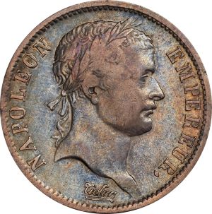 This type was struck 1809-14 during the reign of Napoleon I from numerous mints. The specimen shown is from Lyon and is a rare date. It is priced[1] about six times the commonest date (1811A) even in Good. Many issues of this type are known from a handful (<10) of examples. The type is not difficult to find but is expensive in high grade. All two francs issued prior to 1859, including this one, were demonetized in 1869 to make way for the succeeding issue which was only 0.835 fine. The second specimen was lot 71353 in Stack's Bowers Collectors Choice sale (Costa Mesa, CA, September 2025), where it sold for $384. The catalog description[2] noted, "FRANCE. Empire. 2 Francs, 1810-D. Lyon Mint. Napoleon I. PCGS Genuine--Cleaned, VF Details. Presenting deep gray and plumb hues, this lightly cleaned specimen still retains a great deal of detail throughout. From the Richard Margolis Collection (acquired from Lepczyk in March 1984 for $40). Ex: George Sobin Collection (Joseph Lepczyk - 3/1984) Lot # 1247 (part of)."