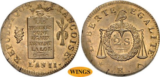This specimen was lot 314 in Classical Numismatic Group's sale of the Lissner Collection (Chicago, August 2014), where it sold for $5,142.50. The catalog description[1] noted, "FRANCE, Premier République. Convention nationale. 1792-1795. Æ Double sol aux balances. Orleans mint; différents: star and dividers. Joseph Amy Guiquero. engraver. Chares-Pierre Delespine, director. Dated L’An 2 R (AD 1794). In NGC encapsulation graded MS 66. Gem lustrous brilliant uncirculated with just a hint of tone. The highest ever graded for any Double sol from 1738-1793. A true wonder coin and very rare. Purchased from Wade Hinderling, December 1992." This coin was minted at Orléans during the throes of the Revolution. 1794 was the year of the Terror. Amid the chaos, large quantities of these copper two sols were issued, along with six and twelve deniers (half and one sols). The 1791-93 issues bear the bust of the king but his ouster forced the removal of his portrait. The obverse shows the tablet of the law with the motto, "LES HOMMES SONT EGAUX DEVANT LA LOI," (all men are equal before the law) and the reverse shows the balance scales of justice. This type was hurriedly and crudely made and is rarely found better than VG.