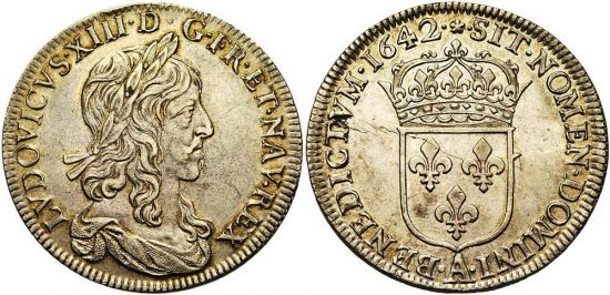 This specimen is a demi-écu struck in Paris at the end of the reign of Louis XIII of France (r. 1610-43). It is a product of a major reform of French coinage which attempted to abolish hammered coinage once and for all. In this the regime was not successful, but large quantities of these handsome coins were released 1641-43 and the type is reasonably available today. All are Paris mint except for a small issue from Lyon in 1643. The last hammered quarter écu listed is dated 1652.