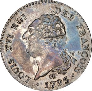 This specimen was lot 43108 in Stack's Bowers ANA sale (Oklahoma City, OK, August 2025), where it sold for $1,800. The catalog description<sup>[1]</sup> noted, "[[France|FRANCE]]. Constitution. 30 Sols, Year 5/1793-D. Lyon Mint. Louis XVI. PCGS MS-62. Colorfully toned and pleasingly struck, this nearly-Choice specimen from the final year of issue provides wondrous eye appeal and towers as the sole representative of the type in the PCGS census. From the Richard Margolis Collection (acquired from Spink in 1986 for $564). Ex: Spink Zürich (10/1986) lot # 813." The specimen shown is a 30 sols (equals 1/4 écu) of the Constitutional period (1791-93) during the French Revolution. | This specimen was lot 43108 in Stack's Bowers ANA sale (Oklahoma City, OK, August 2025), where it sold for $1,800. The catalog description<sup>[1]</sup> noted, "[[France|FRANCE]]. Constitution. 30 Sols, Year 5/1793-D. Lyon Mint. Louis XVI. PCGS MS-62. Colorfully toned and pleasingly struck, this nearly-Choice specimen from the final year of issue provides wondrous eye appeal and towers as the sole representative of the type in the PCGS census. From the Richard Margolis Collection (acquired from Spink in 1986 for $564). Ex: Spink Zürich (10/1986) lot # 813." The specimen shown is a 30 sols (equals 1/4 écu) of the Constitutional period (1791-93) during the French Revolution. | ||