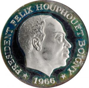 This specimen was lot 23141 in Stack's Bowers ANA sale (Las Vegas, August 2020), where it sold for $75. The catalog description[1] noted, "IVORY COAST. 10 Franc, 1966. PCGS PROOF-65 Deep Cameo Gold Shield. A brilliant proof with frosted devices, mirrored fields, and unusual blue/green to purple toning that outlines devices and legends on both sides." The coinage of the African country of Ivory Coast is scanty, comprising one silver coin and four gold coins, all dated 1966. The country uses the CFA franc for its ordinary transactions.