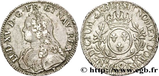 "1731 Rennes 1017756 exemplaires Diameter : 40mm Orientation dies : 6h. 29,35g. Edge: (fleuron) DOMINE (fleuron) (lis) (fleuron) SALVUM (lis) (fleuron) FAC (fleuron) (lis) (fleuron) REGEM Cet écu est frappé sur un flan large et irrégulier présentant de nombreuses traces de chocs. Exemplaire recouvert d’une patine grise de médaillier présentant de petites stries d’ajustage. Obverse LUD. XV. D. G. FR. ET NAV. REX.(Louis XV, par la grâce de Dieu, roi de France et de Navarre). Buste du Roi à gauche, la tête nue, le cou cravaté, portant le cordon et la croix de l'ordre du Saint-Esprit sur une veste brodée ; au-dessous une gerbe. Reverse: SIT NOMEN DOMINI - 9 - BENEDICTUM (Mg) 1731. Écu de France ovale, couronné entre deux branches d'olivier. (Béni soit le nom du Seigneur). D’après nos recherches en archives, l’atelier de Rennes a frappé en 1731 pour 49.230 marcs 3 onces 9 deniers d’argent en écus, demis, cinquièmes, dixièmes et vingtièmes d’écu. Ces monnaies furent délivrées entre le 15 janvier et le 31 décembre 1731 et 640 écus furent mis en boîte."