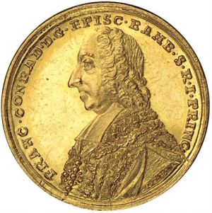 This specimen was lot 646 in Stack's "Vermuele, Ward & Mexico Maxico" sale (New York, January 2010), where it did not sell. The catalog description[1] noted, "GERMAN STATES. BAMBERG. Bishop Franz Conrad von Stadiun-Thannhausen, 1753-1757. Ducat, 1753. Homage of the Bishopric. Bust l. in clerical garb. Rv. Seven-fold Arms under five crests, Chronogram date forms part of the legend Astrae Longos ConCeDat RegIMInIs Annos: 'May the Stars Allow Long Years (of Reign).' Both sides of this late Bamberg issue show flashing prooflike fields, obverse displays minuscule field tics. MS-62 PL (NGC)." The SCWC mentions this as a one year type, along with KM 121, KM 135 and KM 147, each issued on the occasion of the coronation of a new bishop.