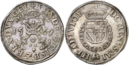 "1567. Felipe II. Nimega. 1 escudo borgoña. Preciosa pátina. Escasa así. EBC-. (city of Nijmegen, Philip II, Burgundian rixdaalder of 1567. Nice patina, scarce thus, about extremely fine.)"