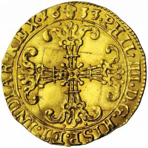 "BRABANT, Duché, Philippe IV (1621-1665), AV couronne d'or, 1633, Bruxelles. Droit: Croix à triple nervure, évidée et feuillue. Revers: Ecu couronné, accosté de deux briquets couronnés. Très Rare. Ex HSA 1244. Superbe. (Duchy of Brabant, Philip IV (1621-65), gold couronne d'or of 1633, Brussels mint. Obverse: floriate, voided cross; reverse: crowned arms divide two crowned jewels. Very rare, extremely fine.)"