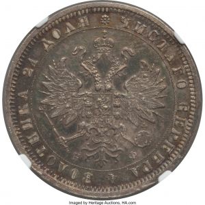 This specimen was lot 34552 in Heritage sale 3076 (Long Beach, CA, September 2019), where it sold for $690. The catalog description[1] noted, "Russia: Alexander II Rouble 1881 CПБ-HФ AU58 NGC, St. Petersburg mint, Well struck with reddish-gold toning. There is little, or no, rubbing on the high points." This type was struck 1859-85 in respectable quantities but not so many as the prior type (Dav-283). Assayer's initials HΦ = Nicolai Follendorf, who operated 1877-82.