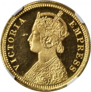 This specimen was lot 21072 in Stack's Bowers ANA Auction (Denver, CO, August 2017), where it did not sell. The catalog description[1] noted, "Superb Gem Proof INDIA. 5 Rupees, 1879-(c). Calcutta Mint. NGC PROOF-66* CAMEO. Struck with a 1/4 Rupee obverse die (dated 1877, Prid-408). Minor strike through present in front of the bust, though otherwise this is a pristine example displaying wondrous cameo qualities. Needle sharp strike and fully brilliant with great eye appeal. Ex: Hammel Collection." The SCWC notes three varieties of this rare issue: bust A (KM 493.1), bust B (KM 493.2) and bust C (KM 493.3). All are restrikes as none were issued for circulation.