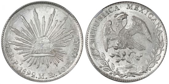 This specimen was lot 1240 in Sedwick sale 25 (Winter Park, FL, May 2019), where it sold for $154.70. The catalog description[1] noted, "San Luis Potosi, Mexico, cap-and-rays 8 reales, 1892MR, NGC MS 63. Brightly lustrous, no wear and minimal marks, the surfaces a bit grainy (as made) and with minor die-cracks. NGC #4486469-014." Assayer MR (Mariano Reyes) served the San Luis Potosi mint for 1886-93 and was there when it closed. This date is common.