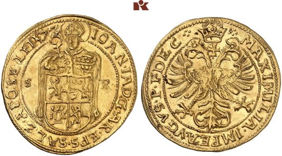 | − | This specimen was lot 2609 in Künker sale 384 (Osnabrück, March 2023), where it sold for €1,500 (about US$1,938 including buyer's fees). The catalog description<sup>[1]</sup> noted, <blockquote>"''Johann Jakob Khuen von Belasi, 1560-1586. 2 Dukaten 1572, mit Titel Maximilians II. Mit ·:· am Anfang und Ende der Rückseitenumschrift. GOLD. Seltene Variante. Min. gewellt, vorzüglich. Exemplar der Auktion Lanz 33, München 1985, Nr. 949.'' (archbishopric of [[Austria, Salzburg|Salzburg]], John Jacob Khuen of Belasi, 1560-86, double ducat of 1572, struck in the name of Maximilian II, with dots at the beginning of the reverse legend. Scarce variety, slightly wavy, extremely fine.)"</blockquote> The Archbishopric of Salzburg was an ecclesiastical state between Bavaria and Austria and usually ruled by a Hapsburg client. This type is listed for 1569-86. The obverse was redesigned to show St. | + | This specimen was lot 2609 in Künker sale 384 (Osnabrück, March 2023), where it sold for €1,500 (about US$1,938 including buyer's fees). The catalog description<sup>[1]</sup> noted, <blockquote>"''Johann Jakob Khuen von Belasi, 1560-1586. 2 Dukaten 1572, mit Titel Maximilians II. Mit ·:· am Anfang und Ende der Rückseitenumschrift. GOLD. Seltene Variante. Min. gewellt, vorzüglich. Exemplar der Auktion Lanz 33, München 1985, Nr. 949.'' (archbishopric of [[Austria, Salzburg|Salzburg]], John Jacob Khuen of Belasi, 1560-86, double ducat of 1572, struck in the name of Maximilian II, with dots at the beginning of the reverse legend. Scarce variety, slightly wavy, extremely fine.)"</blockquote> The Archbishopric of Salzburg was an ecclesiastical state between Bavaria and Austria and usually ruled by a Hapsburg client. This type is listed for 1569-86. The obverse was redesigned to show St. Rupert above the arms, he having been displaced from the reverse by the imperial eagle. In the seventeenth century, Salzburg was blessed with a number of productive silver mines and the prince-archbishop was a prolific issuer of coins, particularly thalers. The archbishopric was secularized in 1803 and passed to [[Austria]] in 1813. |