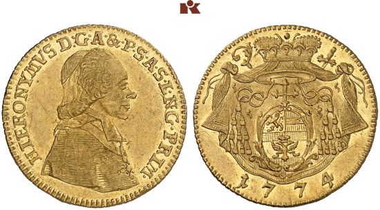 "Hieronymus von Colloredo, 1772-1803. Dukat 1774. Ohne Signatur unter dem Brustbild. GOLD. Sehr schön-vorzüglich. (archbishopric of Salzburg, Hieronymus von Colloredo, 1772-1803, ducat of 1774, without engraver's initials. Very fine to extemely fine.)"
