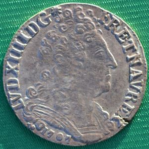 Shown is a ten sols aux insignes (ten sous with insignia) struck at the La Rochelle mint for France in the last years of Louis XIV's reign. The type was struck 1703-08 in substantial numbers but the Metz ("AA") and Strasbourg ("BB") mints struck ten sols aux quatre couronnes. This date is common. The SCWC lists this as a 1/8 écu but Droulers notes this coin is closer to a 1/7 écu.