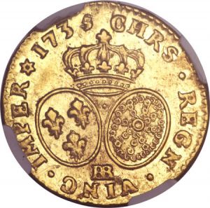 This specimen was lot 23817 in Heritage sale 3024 (Chicago, April 2013), where it sold for $1,500.01. The catalog description[2] noted, "Louis XV gold 1/2 Louis d'Or 1735-BB, AU58 NGC, unlisted date and mintmark in the SCWC, highly lustrous and bold, very attractive and presumably rare." This type is recorded for France for 1726-39 but all the dates are rare with the possible exception of the 1726-A. Droulers[1] lists issues for Strasbourg for 1726, 1732 and 1734-35 but all are rare.