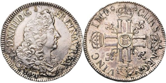"FRANCE, Royaume, Louis XIV (1643-1715), AR écu aux huit L, 1691M couronné, Metz. 1er type. 1e réformation. D/ B. dr. à d. R/ Croix formée de huit L couronnés, cantonnée de quatre lis. Fines griffes. Très Beau à Superbe. (kingdom of France, Louis XIV, 1643-1715, silver écu of the eight "L's" of 1691, Metz mint, first type, first reformation. Obverse:draped bust to right; reverse: cross formed of eight crowned "L's", cantoned with four fleurs-de-lys. Fine scratches, very fine to extremely fine.)"
