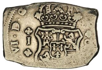 This specimen was lot 9484 in Ponterio sale 151 (Baltimore, November 2009), where it sold for $1495. The catalog description[1] noted, "GUATEMALA. 8 Reales, 1747-J. Full four-digit date, both mint marks, clear assayer's letter and king's ordinal. Quite nice for issue. VERY FINE." Guatemalan cobs are unusual in that they were struck using pillar dies. Guatemala issues are notably cruder than other mints. Conventional milled coinage was introduced in 1754.