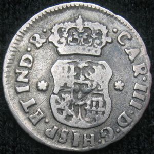 Shown is a 1763 ½ real from the Guatemala mint, of a type issued from 1760 to 1771. The Guatemala ½ real is the only example of Spanish colonial pillar coinage that omits the assayer's initial (should be P). Gilboy[1] notes this date as 'R' or rare.