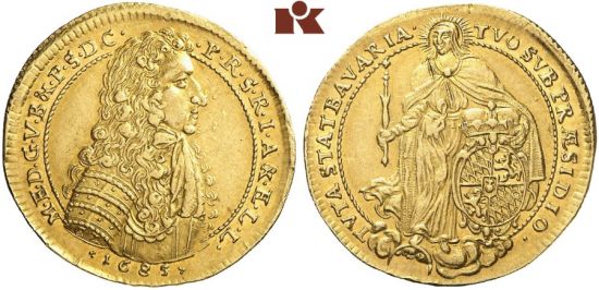 "SEIT 1623 KURFÜRSTENTUM, Maximilian II. Emanuel, 1679-1726. 2 Dukaten 1685, München. Geharnischtes Brustbild r. darunter die Jahreszahl, im Armabschnitt die Signatur CZ (Caspar Zeggin, Stempelschneider in München 1666-1713)//Madonna mit Strahlenkranz steht v. v. in Wolken auf Mondsichel mit Gesicht, den Kopf halbl. gewandt, in der Rechten Zepter, mit der Linken hält sie das mit dem Kurhut bedeckte, vierfeldige Wappen mit Mittelschild. GOLD. RR Vorzüglich. (Germany, Electorate of Bavaria, Maximilian II Emanuel, 1679-1726, double ducat of 1685, Munich mint. Obverse: armored bust to right, date below; reverse: the Madonna stands on a cloud, holding scepter and quartered and capped arms. Rare, extremely fine.)