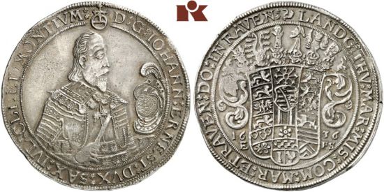 "SACHSEN-COBURG-EISENACH, HERZOGTUM Johann Ernst, 1633-1638. Reichstaler 1636, Coburg. RR Hübsche Patina, sehr schön-vorzüglich. (Germany, duchy of Saxe-Coburg-Eisenach, John Ernest, 1633-38, thaler of 1636, Coburg mint. Rare, toned, very fine to extremely fine.)"