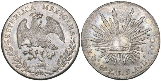This specimen was lot 506 in Morton & Eden sale 104 (London, November 2019), where it sold for £150 (about US$232 including buyer's fees). The catalog description[1] noted, "Republic, 8 reales, Oaxaca mint, 1892 EN, light adjustment marks, nearly as struck, well toned." The Oaxaca mint struck eight reales 1858-93 and the series is replete with rare dates but the SCWC lists this date as common.