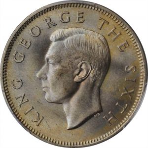 This specimen was lot 23364 in Stack's Bowers NYINC sale (New York, January 2020), where it sold for $95. The catalog description[1] noted, "NEW ZEALAND. Florin, 1948. PCGS MS-65+ Gold Shield. Tremendously gorgeous and immensely pleasing, this exceedingly attractive Gem offers silky luster and a warm, soothing, peripheral tone. A piece for the connoisseur, as it represents the sole finest certified by PCGS for the date. From the Fenton Collection." This florin struck for George VI retained the kiwi reverse introduced with George V. In 1948, the obverse was revised from "GEORGE VI KING EMPEROR" to "KING GEORGE THE SIXTH", and struck in that form until 1951. The denomination was terminated upon decimalization in 1965.