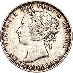 This specimen was lot 2101 in Goldberg sale 93 (Los Angeles, September 2016), where it sold for $246.75. The catalog description[1] noted, "Newfoundland. 50 Cents, 1896 NGC EF45. Victoria. NGC graded EF-45. From the Aurora Family Collection." This type was struck at London (shown here) and Heaton intermittently 1870-1900. Mintages are generally low but it is readily available in grades up to Fine. Newfoundland was admitted into the Dominion of Canada in 1949 and her separate coinage ceased.