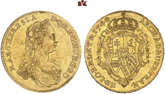 | − | This specimen was lot 3673 in Künker sale 385 (Osnabrück, March 2023), where it sold for €2,000 (about US$2,585 including buyer's fees). The catalog description<sup>[1]</sup> noted, <blockquote>"''RÖMISCH-DEUTSCHES REICH, Maria Theresia, 1740-1780. Dukat 1742, Karlsburg, für Siebenbürgen. GOLD. R Sehr schön-vorzüglich. Erworben 1987 bei der Firma Rittig.'' ([[Austria|Holy Roman Empire]], Maria Theresia, 1740-80, ducat of 1742, Karlsburg mint, for [[Transylvania]]. Rare, very fine to extremely fine.)"</blockquote> This type was struck | + | This specimen was lot 3673 in Künker sale 385 (Osnabrück, March 2023), where it sold for €2,000 (about US$2,585 including buyer's fees). The catalog description<sup>[1]</sup> noted, <blockquote>"''RÖMISCH-DEUTSCHES REICH, Maria Theresia, 1740-1780. Dukat 1742, Karlsburg, für Siebenbürgen. GOLD. R Sehr schön-vorzüglich. Erworben 1987 bei der Firma Rittig.'' ([[Austria|Holy Roman Empire]], Maria Theresia, 1740-80, ducat of 1742, Karlsburg mint, for [[Transylvania]]. Rare, very fine to extremely fine.)"</blockquote> This type was struck 1741-43, early in Maria Theresia's reign. It is scarce. Unlike the Empire, where Maria Theresia had to rule thru her husband Franz (and later her son Joseph), she was queen of Hungary outright. |