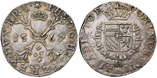 "BRABANT, Duché, Philippe II (1555-1598), AR écu de Bourgogne, 1567, Maastricht. D/ Croix de Bourgogne, sous une couronne, chargée d'un briquet, accostée de la date. R/ Ecu d'Autriche-Bourgogne couronné, entouré du collier de la Toison d'or. Rare. Belle patine. Très Beau à Superbe. (duchy of Brabant, Philip II, 1555-98, silver Burgundian rijksdaalder of 1567, Maastricht mint. Obverse: a Burgundian cross under a crown, charged with a firesteel, divides the date; reverse: crowned arms of Austria-Burgundy, Order chain around. Rare, nice patina, Very Fine - Extremely Fine.)"