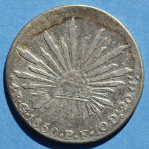 Shown is an 1850GO-PF 4 reales, one of a type struck at the Guanajuato mint 1835-70. Assayer PF is recorded for 1849-61. Ten mints (Mexico City, Guanajuato, Zacatecas, Potosi, Oaxaca, Hermosillo, Real del Catorce, Guadalupe y Calvo, Guadalajara and Culiacan) struck this type of which Zacatecas is tied with Guanajuato as the commonest mint. This date is common.