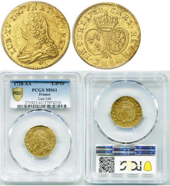 "FRANCE, Royaume, Louis XV (1715-1774), AV louis d'or aux lunettes, 1728AA, Metz. D/ B. drapé à g., tête nue. R/ Ecus ovales de France et de Navarre sous une couronne. Très rare Gradé PCGS MS61. Superbe. (kingdom of France, Louis XV, 1715-74, gold louis of the spectacles of 1728, Metz mint. Obverse: draped bust left with bare head; reverse: oval arms of France and Navarre under a crown. Extremely Fine.)"