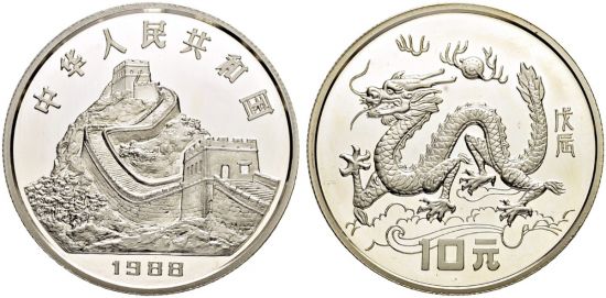 * [[China 1988 50 yuan KM-194|1988 50 yuan, 5 oz silver Year of the Dragon]] | * [[China 1988 50 yuan KM-194|1988 50 yuan, 5 oz silver Year of the Dragon]] |