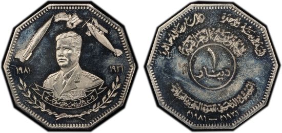 This specimen was lot 1061 in Stephen Album sale 43 (Santa Rosa, CA, May 2022), where it sold for $390. The catalog description[1] noted, "IRAQ: Republic, 1 dinar, 1981, 50th Anniversary of the Iraqi Air Force, PCGS graded Proof 65 DCAM." Iraqi coinage largely ceased after 1982 and the air force was destroyed during the Gulf War.