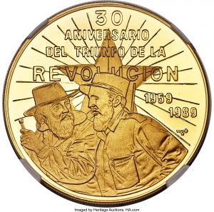 This specimen was lot 30368 in Heritage sale 3081 (New York, January 2020), where it sold for $3,840. The catalog description[1] noted, "Cuba, Republic gold Proof "Revolution Anniversary" 100 Pesos 1989 PR70 Ultra Cameo NGC. Struck for the 30th anniversary of the revolution. Pristine in its production and preservation, a dynamically engraved type. From the El Don Diego Luna Collection." The year 1989 saw the release of many self-congratulatory NCLT's by the regime along with such essentially Cuban topics as the fall of the Bastille and the first Spanish railway. Greeted by disinterest from the world at large, many are now rare.