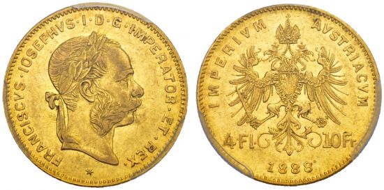 "HEILIGES ROMISCH REICH, Franz Joseph I. 1848-1916. 4 Florin-10 Francs 1888, Wien. Selten. Nur 4'145 Exemplare geprägt. (Austria, Francis Joseph I, 1848-1916, four florins or ten francs of 1888, Vienna mint. Rare. Only 4'145 pieces struck. PCGS AU53.)"