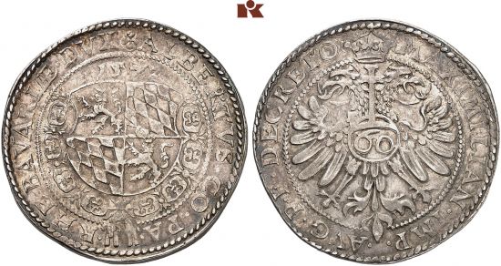 − | This specimen was lot 3386 in Künker sale 335 ( | + | This specimen was lot 3386 in Künker sale 335 (Osnabrück, Germany, March 2020), where it sold for €1,300 (about US$1,701 including buyer's fees). The catalog description<sup>[1]</sup> noted, <blockquote>"''BAYERN, HERZOGTUM, SEIT 1623 KURFÜRSTENTUM, Albert V. der Großmütige, 1550-1579. Guldentaler (60 Kreuzer) 1572, München, mit Titel Maximilians II. R Hübsche Patina, sehr schön-vorzüglich.'' ([[Germany]], duchy of [[German States, Bavaria|Bavaria]], Albert V, 1550-79, gulden thaler or sixty kreuzer of 1572, Munich mint, in the name of Ferdinand I. Rare, nice patina, very fine to extremely fine.)"</blockquote> This is the period when the gulden, fixed at sixty kreuzer, diverged from the thaler, worth 72 kreuzer. The thaler would be raised to ninety kreuzer after the Thirty Years War. |