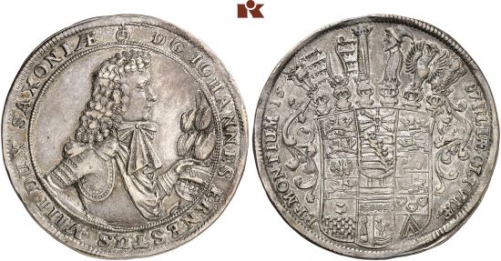 | − | This specimen was lot 4348 in Künker sale 335 ( | + | This specimen was lot 4348 in Künker sale 335 (Osnabrück, Germany, March 2020), where it sold for €2,200 (about US$2,879 including buyer's fees). The catalog description<sup>[1]</sup> noted, <blockquote>"''SACHSEN, SACHSEN-SAALFELD, HERZOGTUM, AB 1735 SACHSEN. Johann Ernst VIII. 1680-1729. Reichstaler 1687, Saalfeld. R Hübsche Patina, sehr schön +.'' ([[Germany]], duchy of [[German States, Saxe-Coburg-Saalfeld|Saxe-Saalfeld]], John Ernest VIII, 1680-1729, thaler of 1687, Saalfeld mint. Scarce, handsome patina, very fine or better.)"</blockquote> This duchy was erected for Johann Ernest VIII in 1680 and was merged with Saxe-Coburg in 1735. |