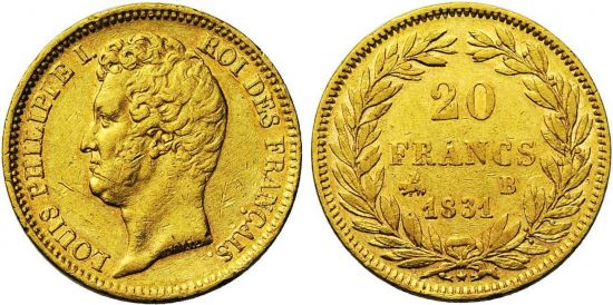 "FRANCE, Louis-Philippe (1830-1848), AV 20 francs, 1831 B, Rouen. Tête nue. Tranche en creux. Rare. Petites griffes. Très Beau. (France, Louis-Philippe (1830-48), gold twenty francs of 1831, Rouen mint, bare head, sunken lettering on edge. Rare, light scratches, very fine.)"