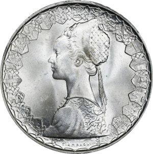 | − | ''Specification:'' 11 g, 0.835 fine silver, 29.3 mm diameter, edge lettered "REPUBBLICA ITALIANA **** 1967 ****" | + | ''Specification:'' 11 g, 0.835 fine silver, 29.3 mm diameter, edge lettered "REPUBBLICA ITALIANA **** 1967 ****", designed by Guido Veroi and Pietro Giampaoli. |