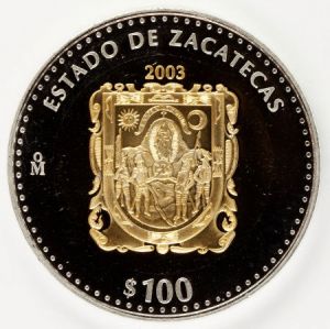 This specimen is one of a series issued by the Mexico City mint to honor each of the Mexican states, this one being for Zacatecas. The program was modeled on the U. S. Mint's state quarter program and was quite popular. The first series, featuring the arms of each state, was issued in reverse alphabetical order, starting with Zacatecas. It was also issued as a bimetallic gold/silver commemorative. The second series, commencing in 2005, featured state animals, monuments, heroes, etc. The circulating coins are the same weight and diameter as the bimetallic fifty pesos of 1993-95 (KM 571). This specimen is a gold and silver bimetallic proof. This specimen was lot 22993 in Heritage sale 3010 (Boston, August 2010), where it sold for $632.50. The catalog description[1] noted, "Estados Unidos Bi-Metallic gold and silver 100 Pesos 2003, Proof. Celebrating the 180th anniversary of federation."
