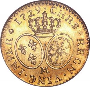 * [[France 1729-CC 1/2 louis d'or|1729-ϽC ''demi-louis d'or aux lunettes'']] | * [[France 1729-CC 1/2 louis d'or|1729-ϽC ''demi-louis d'or aux lunettes'']] | ||