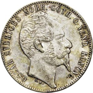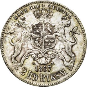 [[Image:Sweden 1857 2 riksdaler rev H3029-31011.jpg|300px|thumb|photo courtesy Heritage Auction Galleries]] | [[Image:Sweden 1857 2 riksdaler rev H3029-31011.jpg|300px|thumb|photo courtesy Heritage Auction Galleries]] | ||