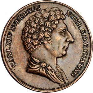 This specimen was lot 10737 in Ponterio sale 169 (Baltimore, November 2012), where it sold for $258. The catalog description[1] noted, "SWEDEN. Skilling, 1832. Attractive Chocolate toning. EXTREMELY FINE." By the reform of 1830, 32 skilling banco = one riksdaler. This one-year type is scarce. The type of 1835-43 with a modified reverse is much more available. The denomination was terminated in 1855. Carl was originally a general in Napoleon's army who accepted the Swedish king's invitation to marry the king's daughter and become his heir. He ruled 1818-44 and his descendants reign over Sweden today.