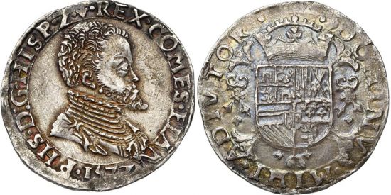 "VLAANDEREN, Graafschap, Philips II (1555-1598), AR vijfde Philipsdaalder, 1572, Brugge. Vz/ Geharnast bb. r. Kz/ Gekroond wapenschild op een Bourgondisch kruis tussen twee vuurijzers. Zeer Fraai à Prachtig. (county of Flanders, Philip II, 1555-98, silver fifth daalder of 1572, Bruges mint. Obverse: armored bust right; reverse: crowned arms over a Burgundian cross between two jewels of the Order of the Golden Fleece. very fine to extremely fine.)"