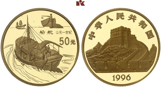 − | This specimen was lot 3748 in Künker sale 406 ( | + | This specimen was lot 3748 in Künker sale 406 (Osnabrück, March 2024), where it sold for €2,800 (about US$3,674 including buyer's fees). The catalog description<sup>[1]</sup> noted, <blockquote>"''CHINA, Volksrepublik. 50 Yuan 1995. Erfindungen und Entdeckungen des Altertums - 5. Serie. Schiff. 15,55 g Feingold. GOLD. R Polierte Platte.'' (people's republic of [[China]], fifty yuan of 1995, ancient inventions and discoveries, ship. Rare, proof.)"</blockquote> This NCLT is one of a series honoring Chinese inventions and discoveries. |