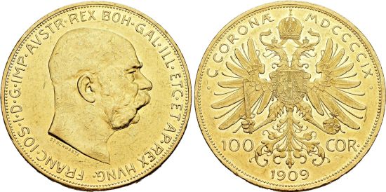 "Osterreich, Franz Joseph I. 1848-1916. 100 Kronen 1909, Wien. Vorzüglich-FDC. Winzige Kratzer. (empire of Austria-Hungary, Francis Joseph I, 1848-1916, one hundred kronen of 1909, Vienna mint. Extremely fine-uncirculated, Minor scratches.)"