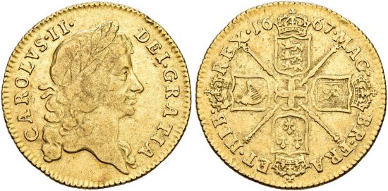 | − | This specimen was lot 1149 in Sincona sale 79 ( | + | This specimen was lot 1149 in Sincona sale 79 (Zürich, October 2022), where it sold for 1,700 CHF (about US$2,038 including buyer's fees). The catalog description<sup>[1]</sup> noted, "[[Great Britain|GREAT BRITAIN]] | Königreich, Charles II. 1660-1685. Guinea 1667, London. Third laureate bust. NGC VF Details. Lightly cleaned." The first series of gold coins of Charles II reverted to the old practice of not dating them and come in denominations of unite, double crown and crown. When milled coinage was introduced in 1663, these denominations were retired in favor of the guinea, its fractions and multiples. The guinea would be the basis for all gold issues until the reform of 1817 and took its name from the source of the original gold, the Gulf of Guinea in west Africa. The second laureate bust was used 1664-73 with or without an elephant below the bust. |
