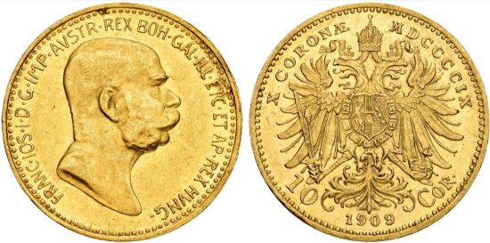 "RDR / ÖSTERREICH Franz Joseph I. 1848-1916. 10 Kronen 1909, Wien. Stempel von R. Marschall. Gutes vorzüglich. (empire of Austria, Francis Joseph I, 1848-1916, ten corona of 1909, Vienna mint, dies by R. Marschall. About Uncirculated.)"