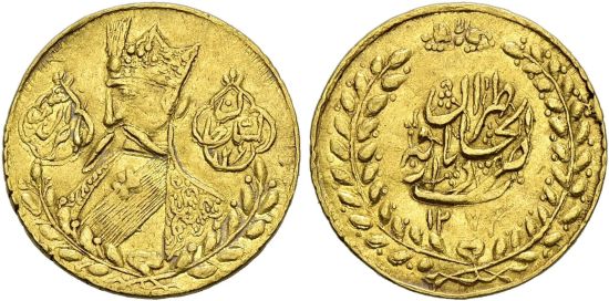 This gold denomination, tho less common than the toman, was struck at numerous mints in the beginning of the reign of Nasir al-Din Shah. This style is listed from Tehran for AH 1272 only, the bust obverse makes it rare. This example realized ten times the catalog value.