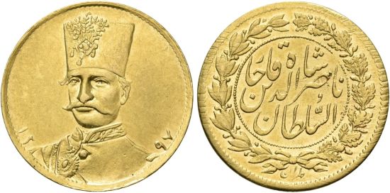 | − | This specimen was lot 1034 in Sincona sale 85 ( | + | This specimen was lot 1034 in Sincona sale 85 (Zürich, October 2023), where it sold for 800 CHF (about US$1,077 including buyer's fees). The catalog description<sup>[1]</sup> noted, <blockquote>"[[Iran|IRAN]], Nasir al-Din Shah, 1264-1313 AH (1848-1896). 1/2 Toman 1297 AH (1880 AD), Tehran Mint. Bust type. Rare. NGC MS61. From the Kian collection, auction SINCONA 49, October 2018, lot 19. Finest certified by NGC."</blockquote> With the coming of the milled coinage, all of the branch mints were closed and all production was completed in Tehran. The SCWC lists this scarce type for AH 1297-1313. One thousand dinars made a kran and ten kran made a toman. The largest silver coin was the [[Iran AH 1297 5000 dinars KM-914|five krans]]. |